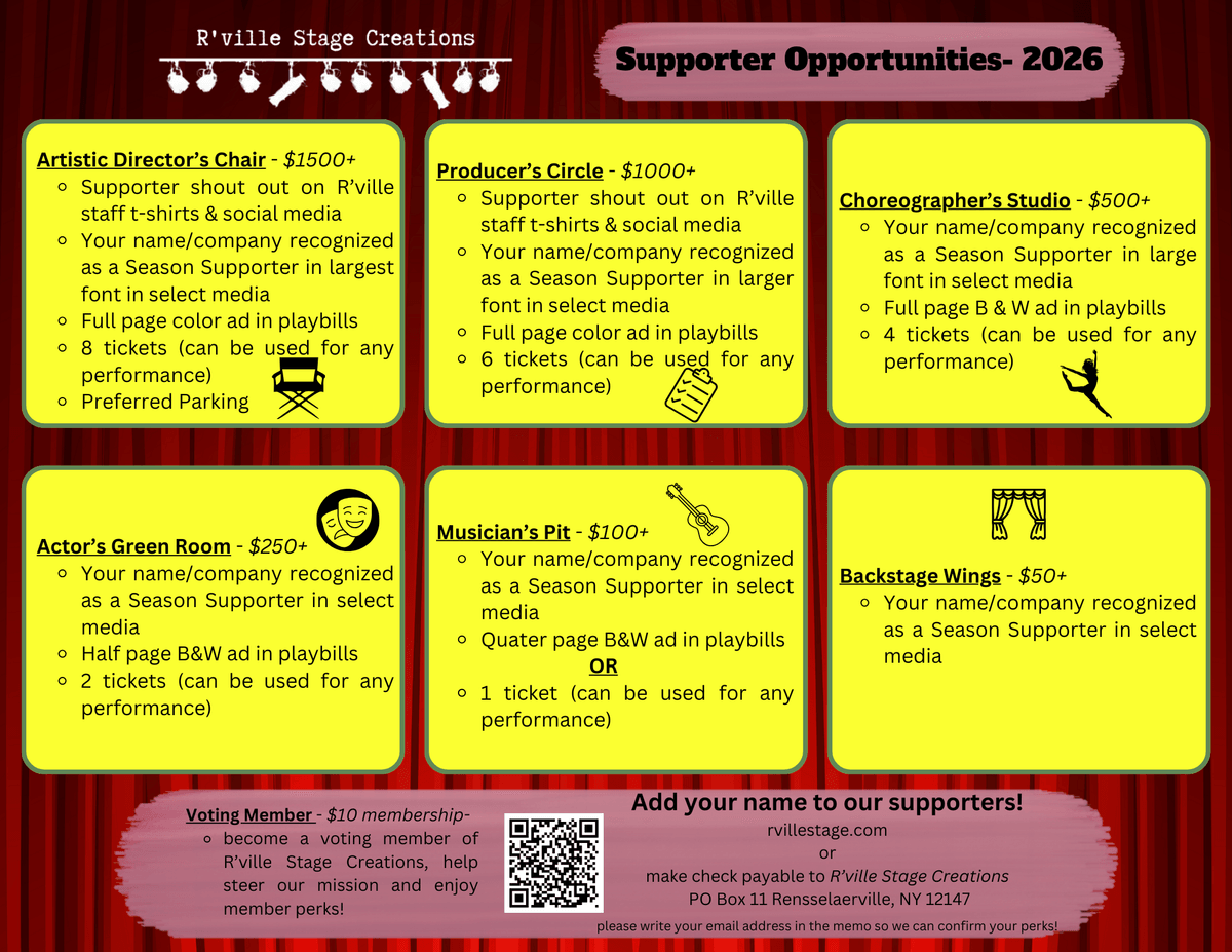 R'ville Stage Creations is a membership-based non-profit organization. By choosing to become a dues-paying member, you will help cover our annual operating costs. Dues-paying members may attend board meetings, nominate and vote for board members, and stand for board election.